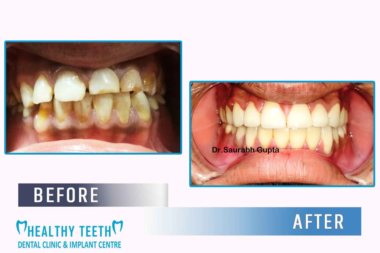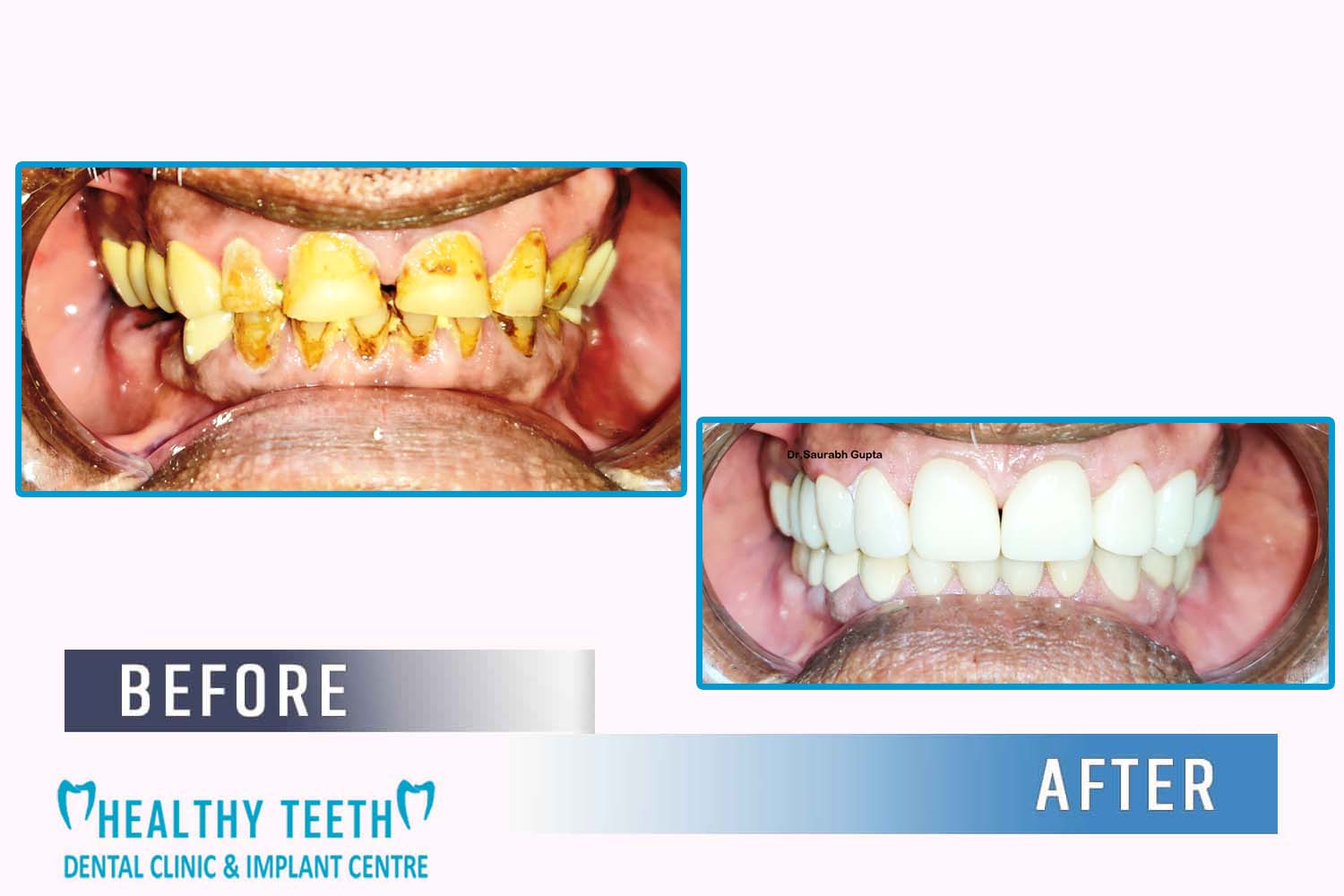 Full Mouth Reconstruction of multiple missing, carious and severely attrited and damaged teeth with Extraction, Root Canal Treatment, and full mouth Zirconia Crowns and Bridges (All ceramic crowns and bridges).